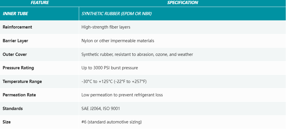 SPECS Product Features 1. Material Composition: Inner Tube: Typically made of synthetic rubber (such as EPDM or NBR) designed to be impermeable to refrigerant gases. Reinforcement Layers: Multiple layers of high-strength fiber or fabric to provide flexibility and resistance to high pressures. Barrier Layer: An essential layer to prevent refrigerant permeation and ensure long-term performance. Cover Layer: An outer layer made of synthetic rubber resistant to abrasion, weathering, and ozone. 2. Construction: 5-Layer Design: This structure usually includes an inner tube, barrier layer, two or more reinforcement layers, and an outer cover. This design enhances the hose’s durability, flexibility, and resistance to pressure and temperature extremes. 3. Compatibility: Refrigerant: Specifically designed for R1234yf refrigerant, ensuring optimal performance and compatibility with the latest automotive air conditioning systems. Size: Size #6, which corresponds to the standard sizing in the automotive industry for specific applications. 4. Performance Specifications: Pressure Rating: Capable of withstanding high operating pressures typical in automotive air conditioning systems. Usually, these hoses can handle burst pressures up to 3000 PSI or higher. Temperature Range: Operational temperature range suitable for automotive environments, typically between -30°C to +125°C (-22°F to +257°F). Permeation Rate: Low permeation rates to ensure minimal loss of refrigerant over time. 5. Standards Compliance: Certifications: Compliance with international standards such as SAE J2064, ISO 9001, or other relevant automotive and quality certifications. Environmental Compliance: Adherence to environmental regulations, ensuring the hose materials and manufacturing processes are eco-friendly. 6. Durability: Abrasion Resistance: Outer cover designed to resist abrasion, extending the hose’s lifespan even in harsh conditions. Ozone and UV Resistance: Materials that can withstand exposure to ozone and ultraviolet light, preventing degradation over time. Vibration Resistance: Engineered to absorb and resist vibrations, which is crucial in automotive applications to prevent damage and leaks. 7. Flexibility: Bend Radius: Designed to have a small bend radius to facilitate easy installation and routing in tight spaces within the vehicle’s engine compartment. Flexibility: Maintains flexibility over a wide temperature range, ensuring ease of handling and installation without compromising performance. Example Technical Data: